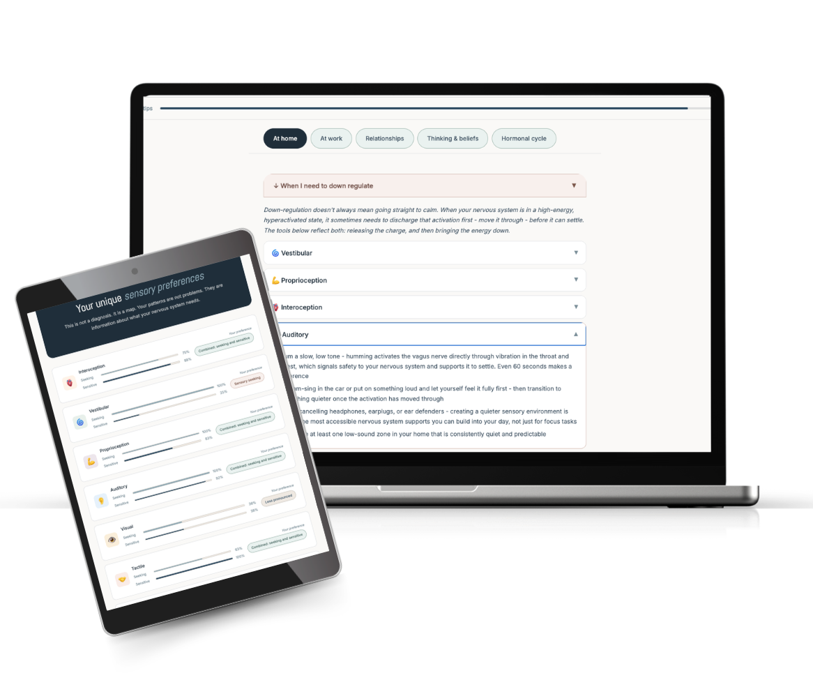 For women and girls with ADHD, and those who are simply curious about how their nervous system works. Understand your sensory patterns. Leave with practical tools matched to your results.